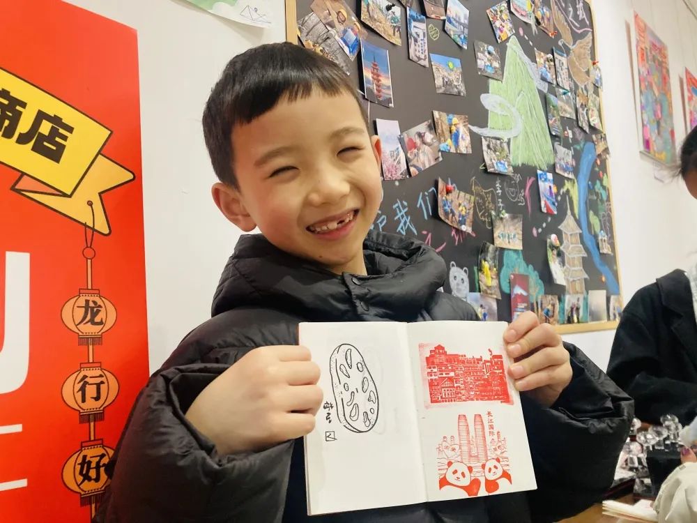七岁的梁言小朋友在展览上参加重庆艺术ip集章活动。记者 赵欣 摄