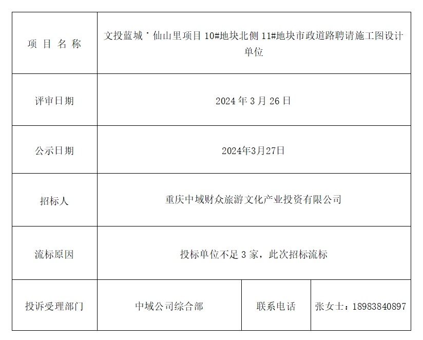 文投蓝城·仙山里项目10#地块北侧11#地块市政道路聘请施工图设计单位流标公告